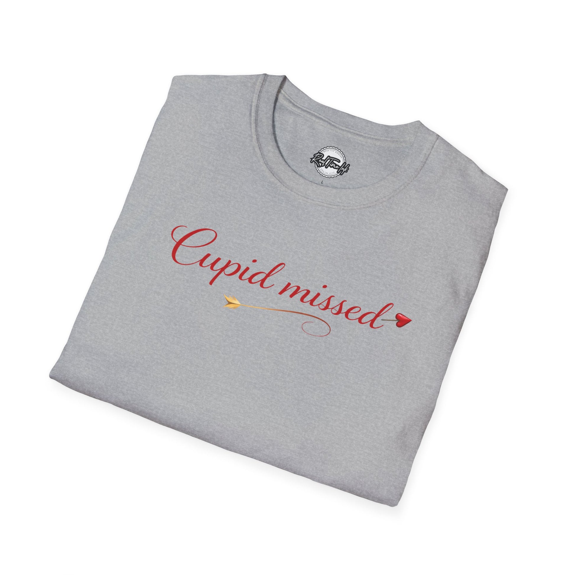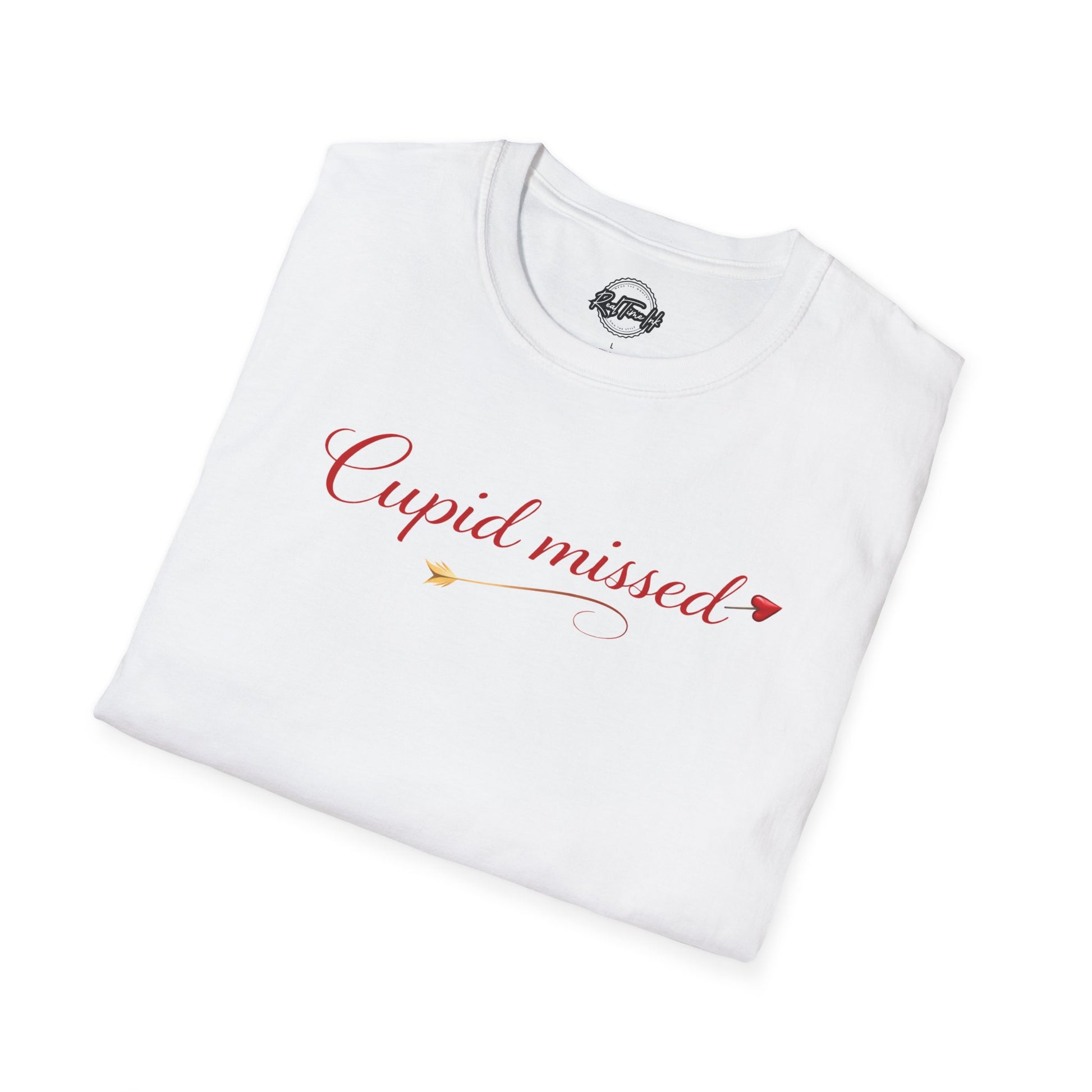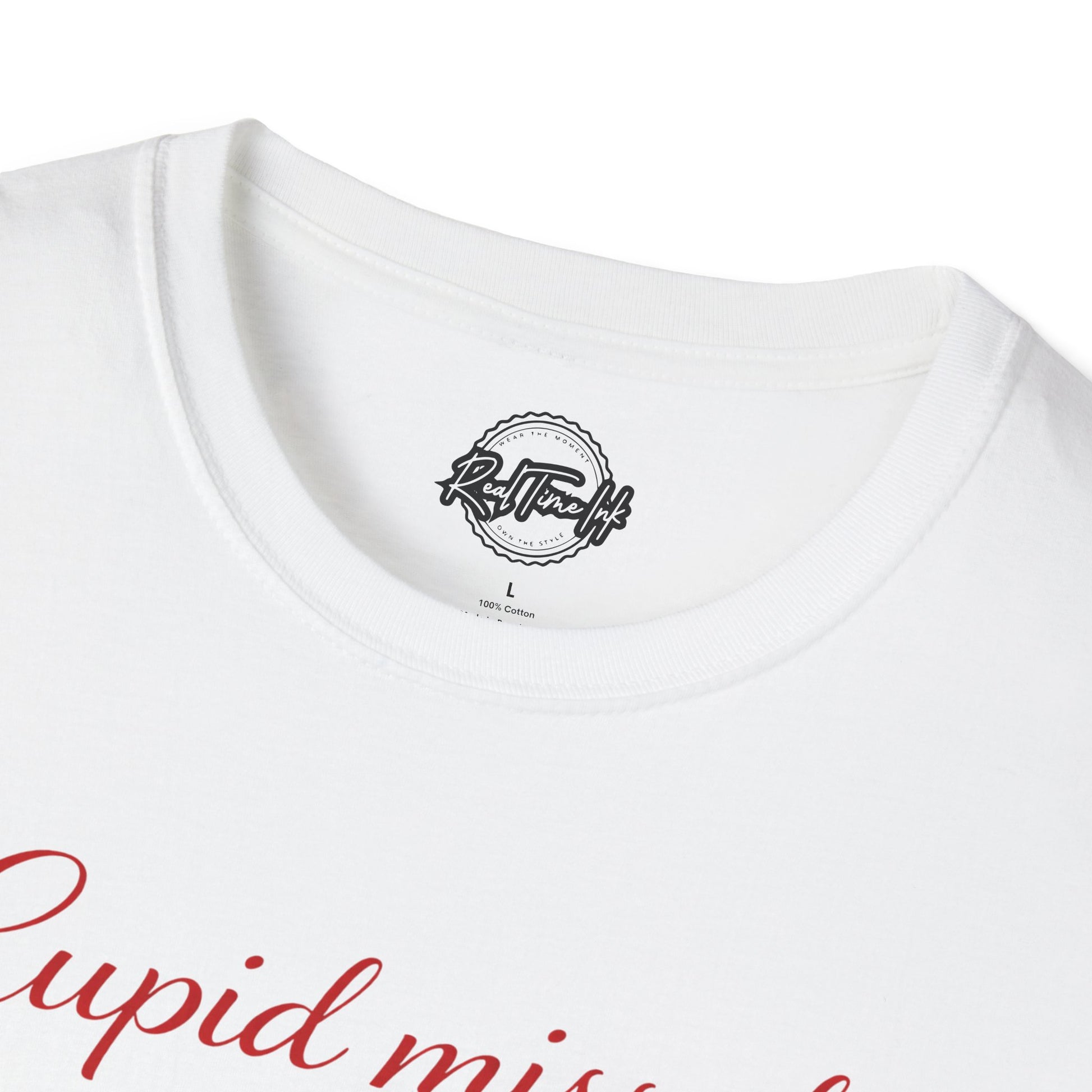 Lightweight, soft, and quietly cheeky — this tee carries a small, romantic statement across the chest in delicate script: “Cupid missed.” The clean white canvas and subtle heart accents let the message breathe, so it reads like a knowing smile rather than a shout. Slip it on with jeans and a coffee in hand, wear it layered under a cardigan for low-key date nights, or let it sit front-and-center at a Galentine’s brunch. The feel is comfortable all day, the look is understated and playful, and the tone says you’re perfectly okay being a little offbeat about love.