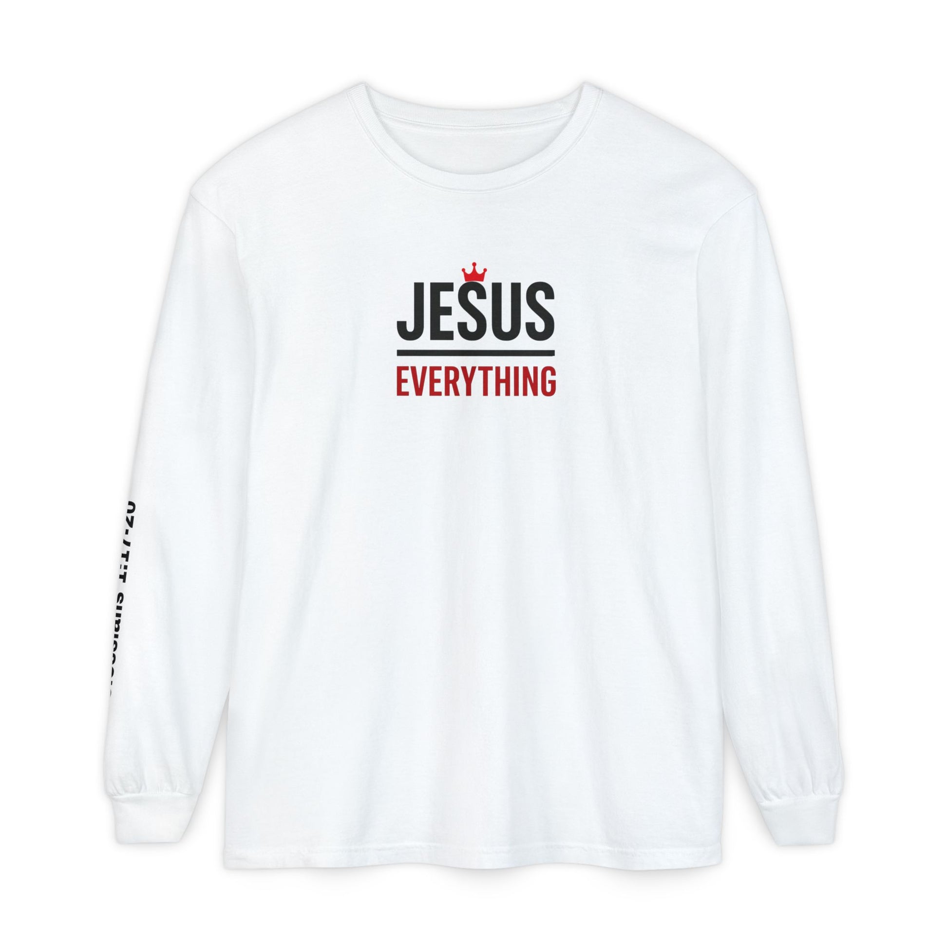This unisex garment-dyed long sleeve shirt features a simple yet powerful design with 'Jesus over Everything'. It gives a spiritual and peaceful vibe, perfect for those who prioritize their faith. Ideal for Christians, this shirt is relevant for religious gatherings, holidays, and everyday wear.