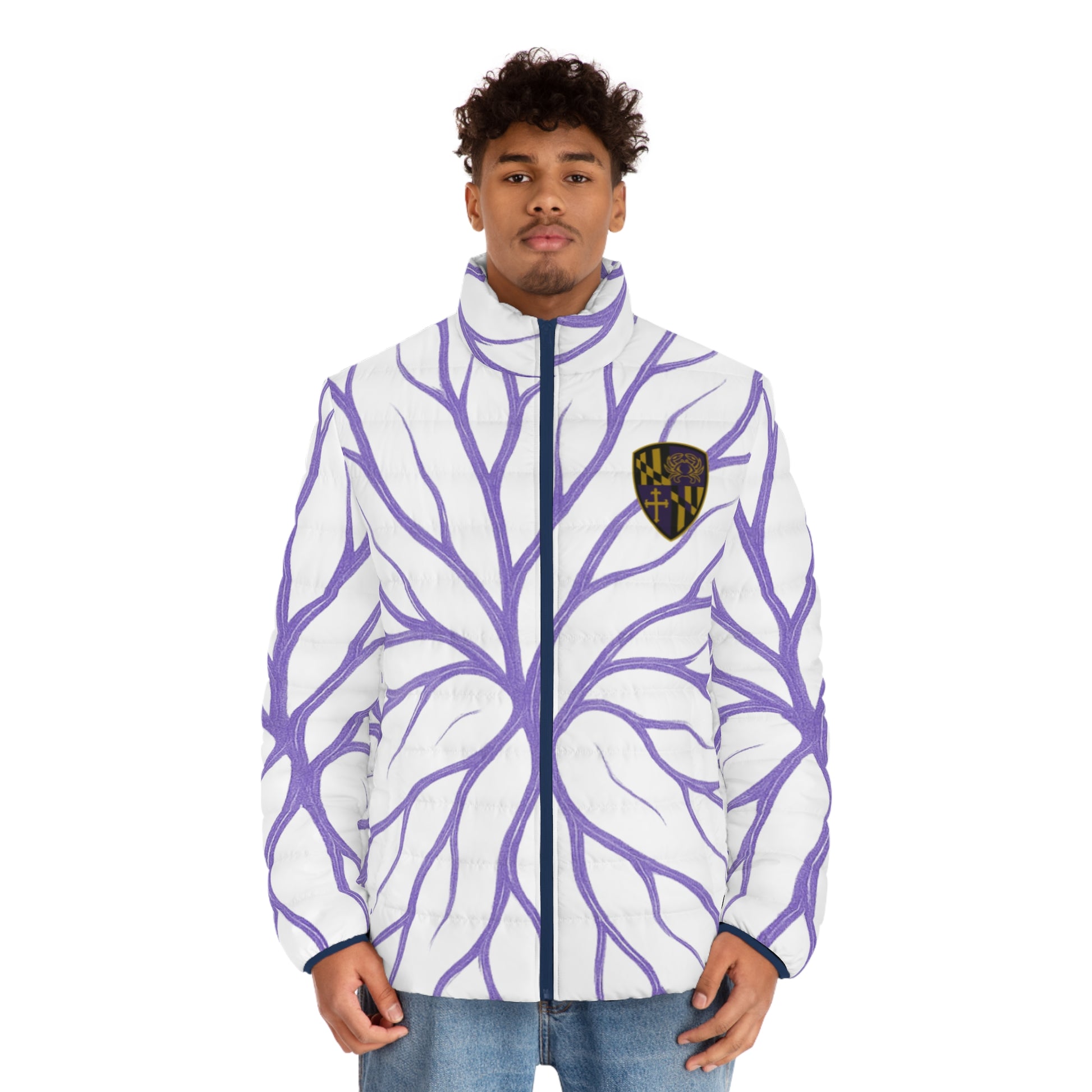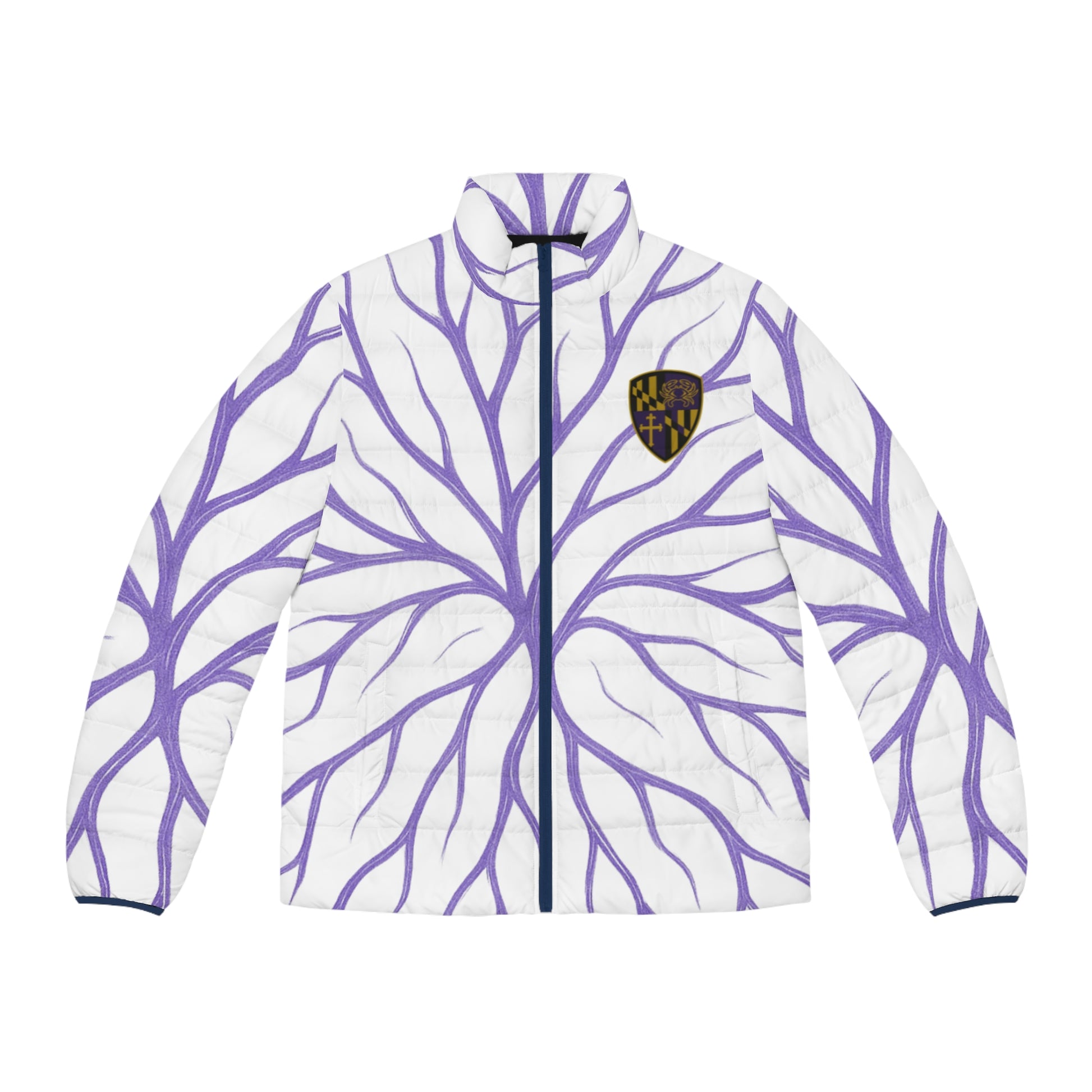 Stay warm and stylish with this Men's Puffer Jacket featuring the unique 'Baltimore Blood' design. Made of 100% polyester with a black cotton-like lining for added comfort. Perfect for those looking to make a bold fashion statement during the winter season.